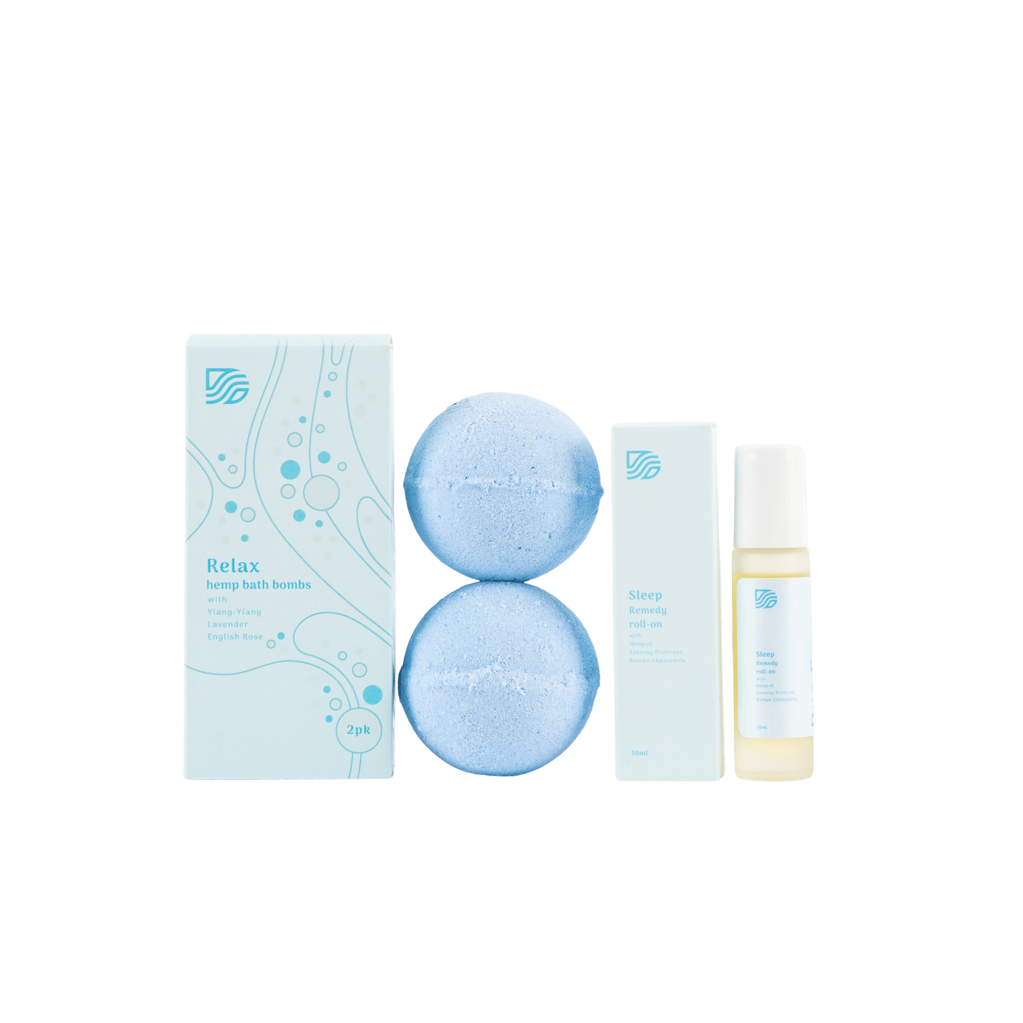 The Sleep Bundle brings together calming essentials designed to support a relaxing nighttime routine. It combines CBD bath bombs, a CBD aromatherapy roll-on for sleep, and CBD + CBN sleep capsules to help you unwind, relax, and prepare for rest.