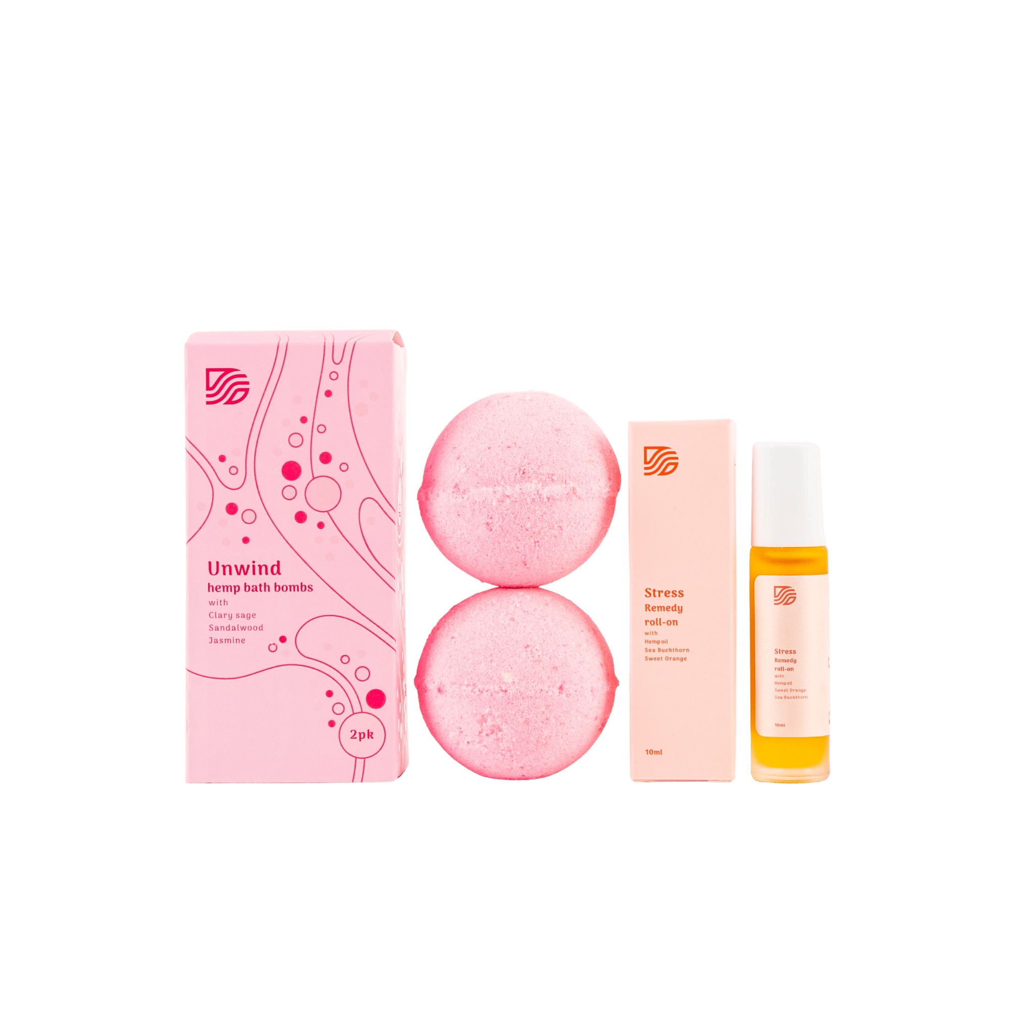 Our Unwind Stress Relief Bundle combines two soothing essentials — CBD bath bombs and a CBD and aromatherapy roll-on — for complete mind-body relaxation. The bath bombs melt away tension with Clary Sage, Jasmine, and Sandalwood, while the roll-on blends Sweet Orange and Bergamot to promote emotional calm and focus.